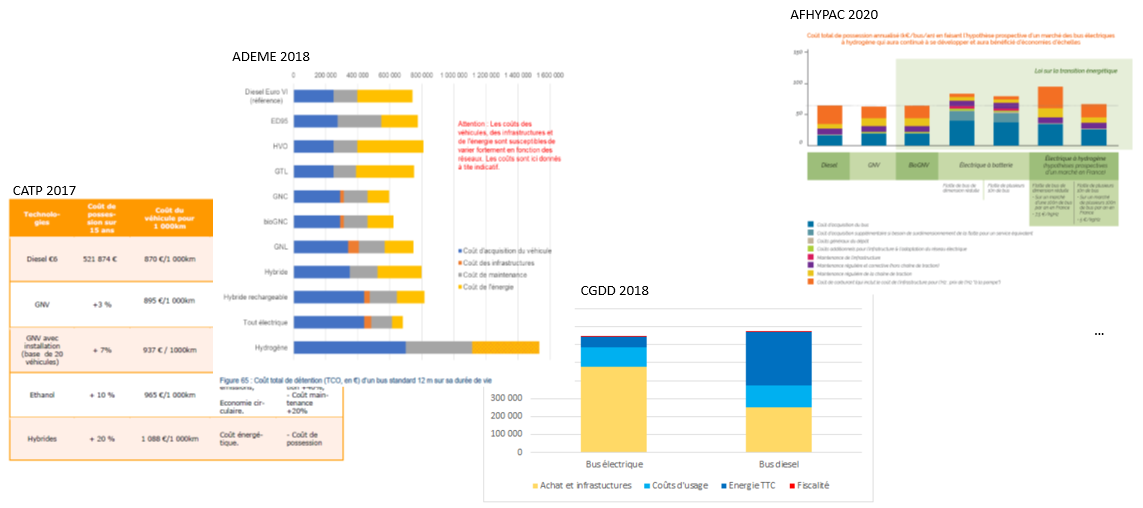 Prenons quelques exemples avec les coûts publiés par l’ADEME, France Hydrogène (ex AFHYPAC), la Centrale d’Achat du Transport Public (CATP), le Commissariat Général au Développement Durable (CGDD, Ministère de la Transition Ecologique)